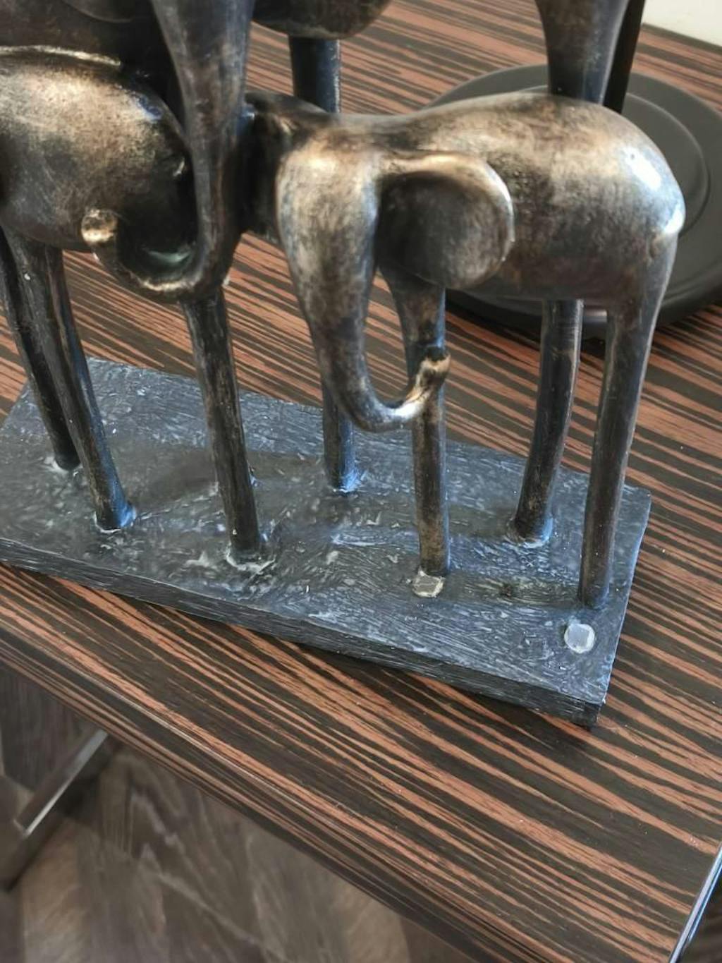 Un problème est survenu durant le transport un des éléphant s'est dessoudé du socle il semblerait que cette sculpture soit très fragile! J'ai envoyé un message au vendeur avec une photo j'attends des nouvelles !