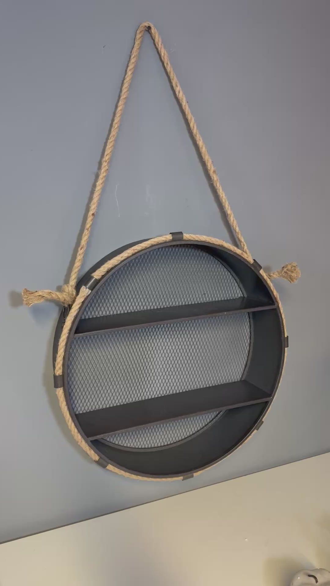 Add rustic elegance to your walls with this charming round hanging wall shelf. The aged black metal frame combined with the brown rope accent creates a perfect blend of industrial and farmhouse styles. With its three-tier design, this shelf is ideal for displaying decorative pieces, small plants, or everyday essentials, making it a versatile addition to any room.